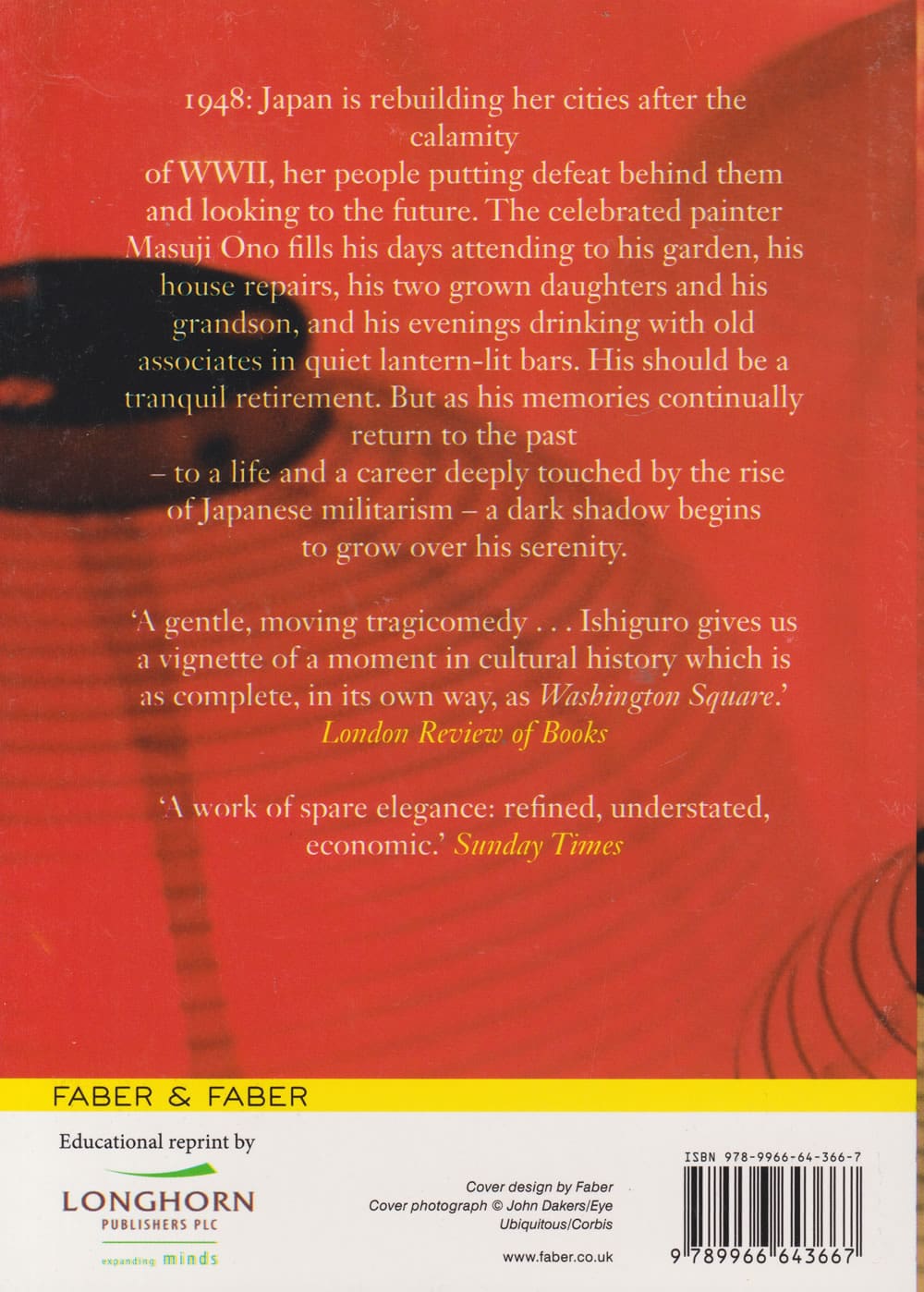 1948: Japan is rebuilding her cities after the calamity; of WWII, her people putting defeat behind them and looking to the future. The celebrated painter Masuji Ono fills his days attending to his garden, his house repairs, his two grown daughters and his erandson, and his evenings drinking with old associates in quiet lantern-lit bars. His should be a tranquil retirement. But as his memories continually return to the past to life and a career deeply touched by the rise of Japanese militarism a dark shadow begins to grow over his serenity.