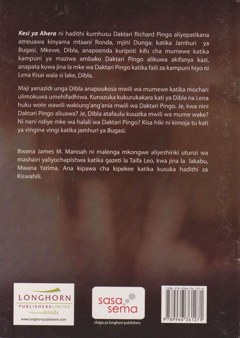 Kesi ya Ahera ni hadithi kumhusu Daktari Richard Pingo aliyepatikana ameuawa kinyama mtaani Ronda, mjini Dunga; katika Jamhuri ya Bugasi. Mkewe, Dibla, anapoenda kuripoti kifo cha mumewe katika kampuni ya maziwa ambako Daktari Pingo alikuwa akifanya kazi, anapata kuwa jina la mke wa Daktari Pingo katika faili za kampuni hiyo ni Lena Kisai wala si lake, Dibla.