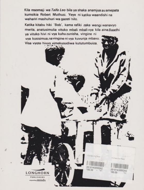 Kila msomaji wa Taifa Leo bila ya shaka anamjua au amepata kumsikia Robert Muthusi. Yeye ni katika waandishi na wahariri mashuhuri wa gazeti hilo. Katika kitabu hiki ?Bob?, kama rafiki zake wengi wanavyo mwita, anatusimulia vituko mbali mbali vya kila aina.Baadhi ya vituko hivi ni vya kuhuzunisha, vingine ni vya kusisimua, na vingine ni vya kuvunja mbavu. Visa vyote hivyo vimekusudiwa kututumbuiza.