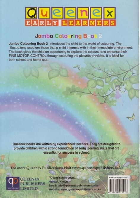 Jambo Colouring Book 2 introduces the child to the world of colouring. The illustrations used are those that a child interacts with in their immediate environment. The book gives the child an opportunity to explore the colours and enhance their FINE MOTOR CONTROL through colouring the pictures provided. It is ideal for both school and home use.