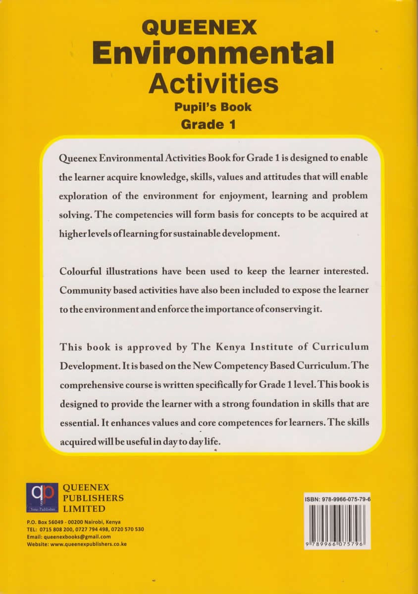 Queenex Environmental Activities Book for Grade 1 is designed to enable the learner to acquire knowledge, skills, values and attitudes that will enable exploration of the environment for enjoyment, learning and problem-solving. The competencies will form a basis for concepts to be acquired at higher levels of learning for sustainable development.