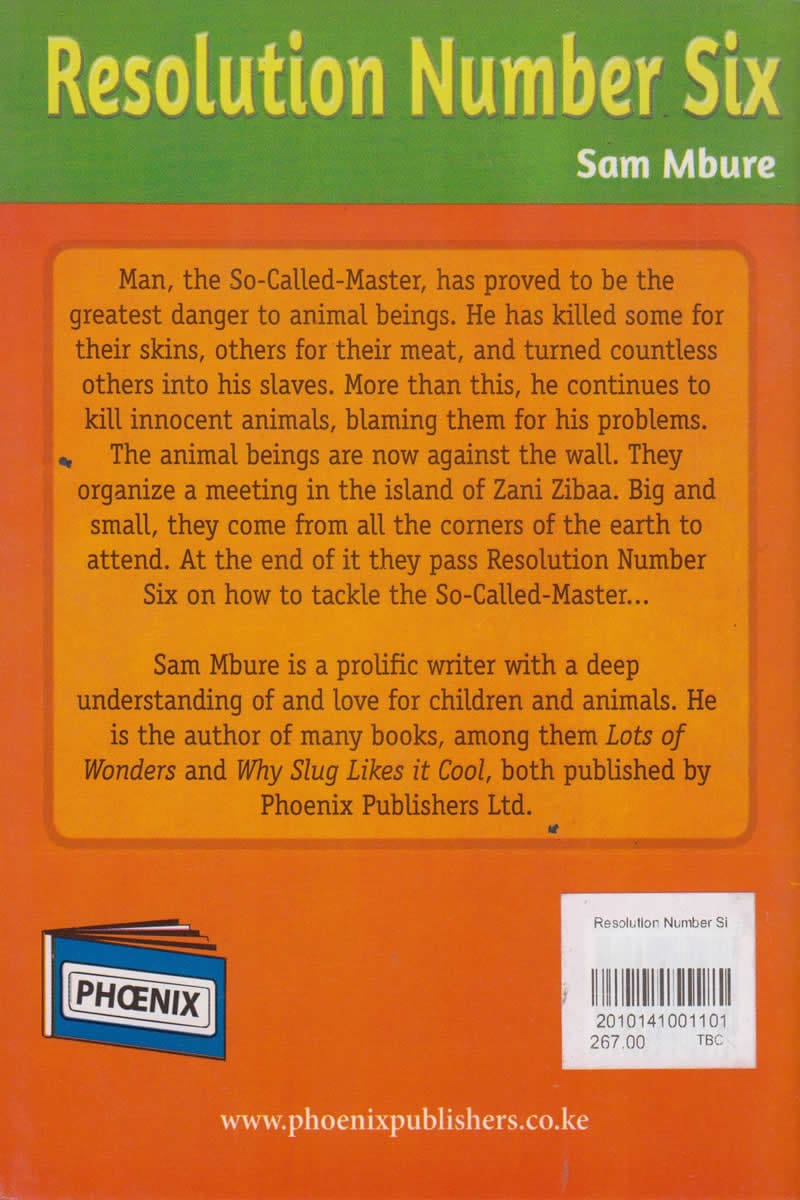 Man, the So-Called-Master, has proved to be the greatest danger to animal beings. He has killed some for their skins, others for their meat, and turned countless others into his slaves. More than this, he continues to kill innocent animals, blaming them for his problems. The animal beings are now against the wall. They organize a meeting in the island of Zani Zibaa. Big and small, they come from all the corners of the earth to attend. At the end of it they pass Resolution Number Six on how to tackle the So-Called-Master??