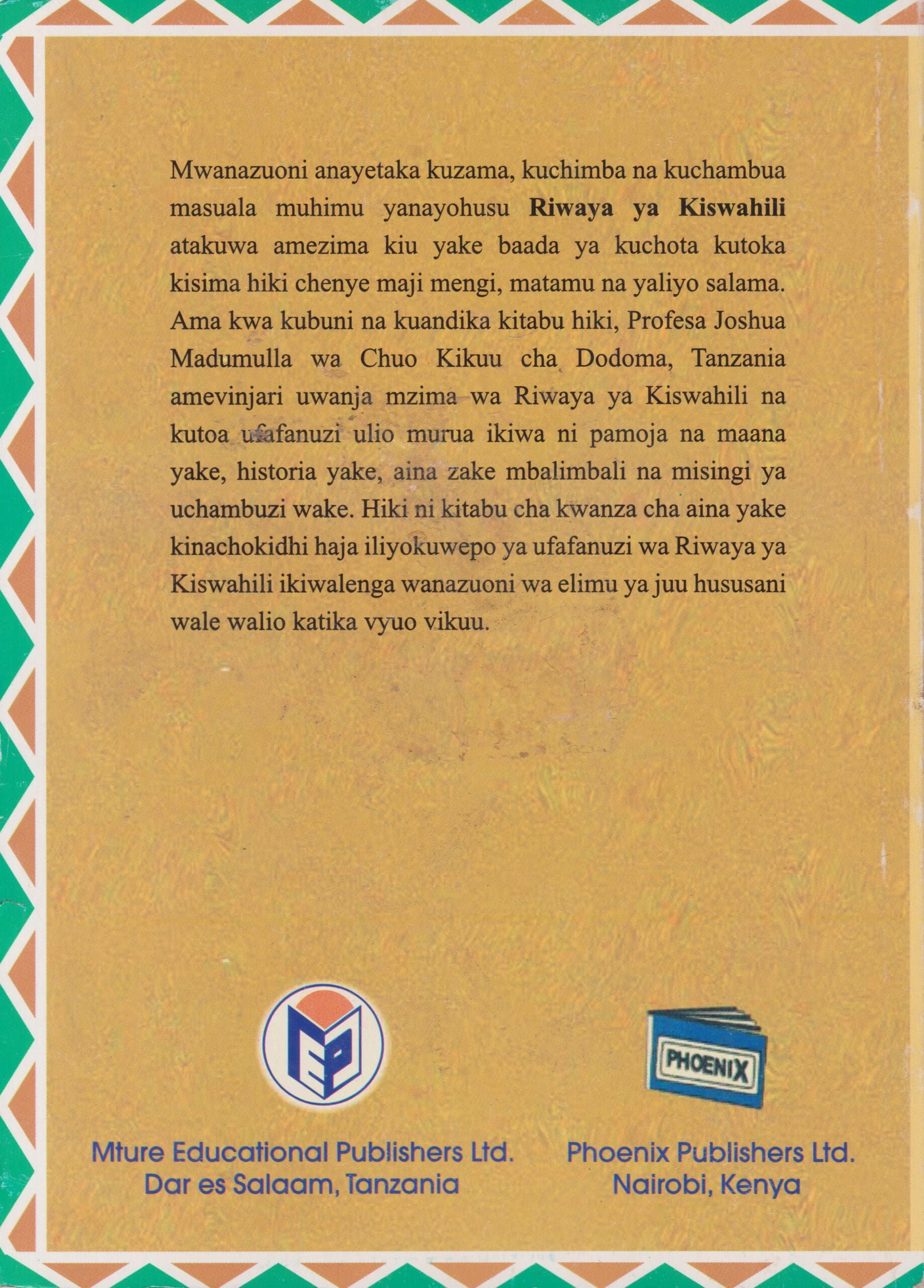 Mwanazuoni anayetaka kuzama, kuchimba na kuchambua masuala muhimu yanayohusu Riwaya ya Kiswahili atakuwa amezima kiu yake baada ya kuchota kutoka kisima hiki chenye maji mengi, matamu na yaliyo salama. Ama kwa kubuni na kuandika kitabu hiki, Profesa Joshua Madumulla wa Chuo Kikuu cha Dodoma, Tanzania amevinjari uwanja mzima wa Riwaya ya Kiswahili na
