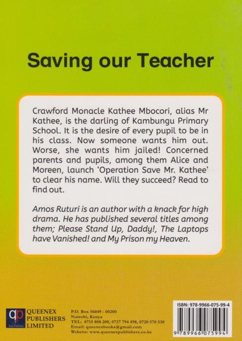 Crawford Monocle Kathee Mbocori, alias Mr Kathee, is the darling of Kambungu Primary School. It is the desire of every pupil to be in his class. Now someone wants him out. Worse, she wants him jailed! Concerned parents and pupils, among them Alice and Moreen, launch ?Operation Save Mr. Kathee? to clear his name. Will they succeed? Read to find out.